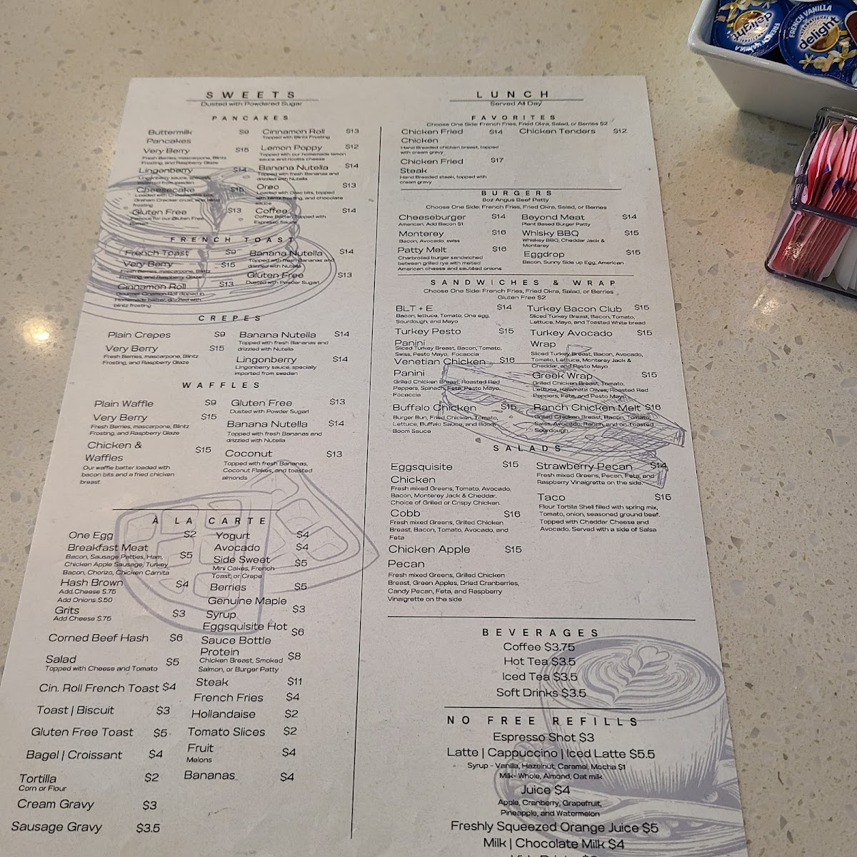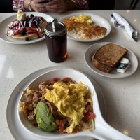 The menu is thoughtfully curated, featuring classic options like the Traditional Two Eggs, customizable to your liking. Whether you prefer them scrambled or poached, paired with sides like bacon or fresh berries, there's something for everyone. The Chicken Fried Chicken and Corned Beef Hash are standout entrees, showcasing comfort food at its finest.